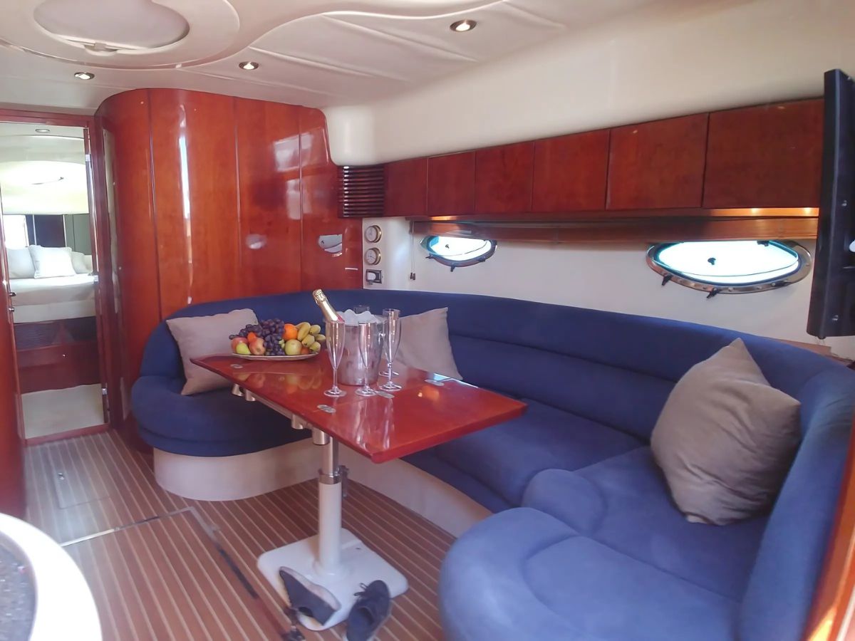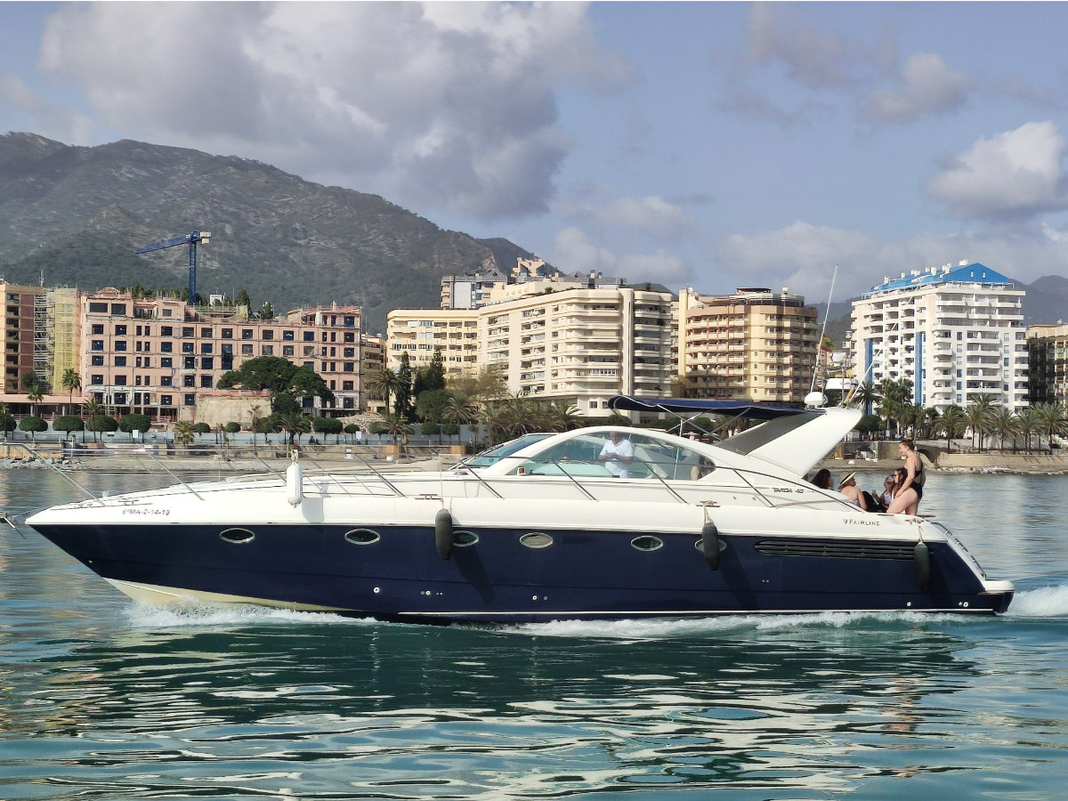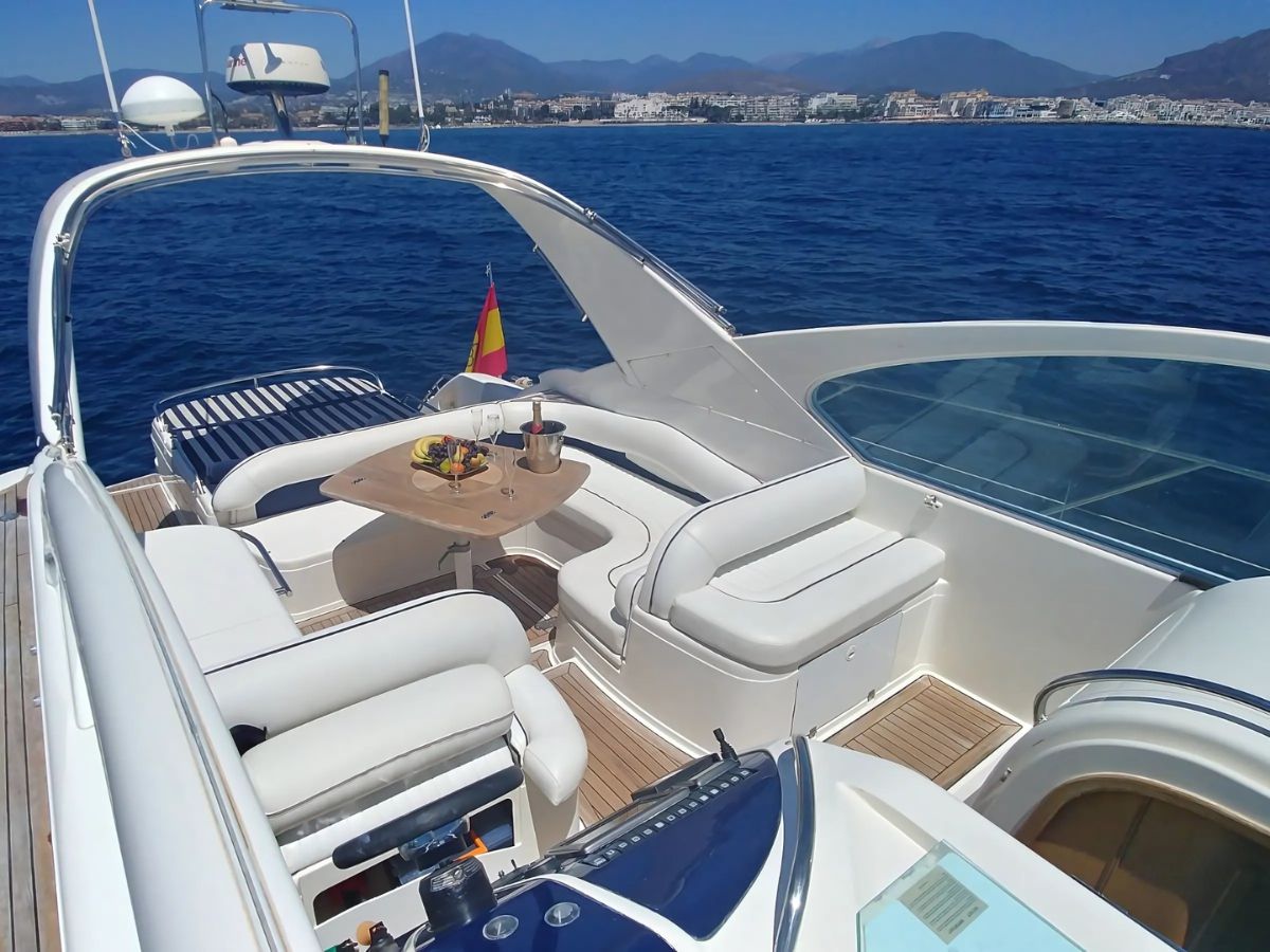 Step aboard the Fairline Targa 48, a yacht for up to 11 guests, with spacious sundecks, swimming platform, and elegant onboard comforts. Enjoy spacious sunbathing areas at the bow and stern, a swimming platform, exterior shower, and an awning sunroof. On board, you’ll find two bathrooms and a fully equipped kitchen. The perfect choice for your charter from Puerto Banús.