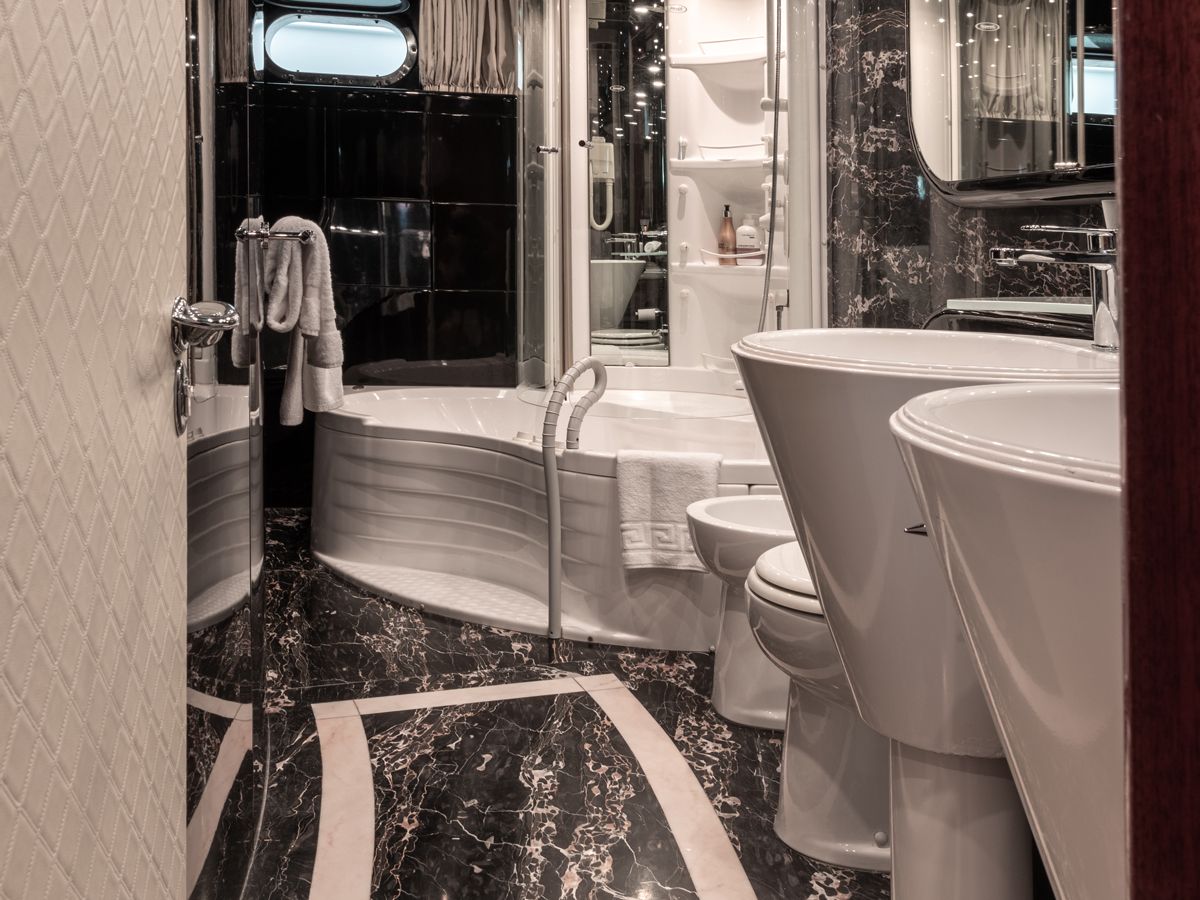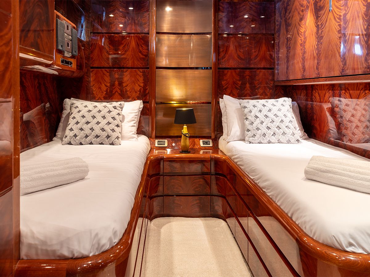 This impressive yacht features two double ensuite cabins and two twin ensuite cabins, providing spacious comfort for up to eight guests staying overnight. Relax on generous decks, enjoy a wide array of included water sports—jet ski, sea scooter, paddle surf, tender, wakeboard, water ski, and donut—and savour drinks, snacks, and the attentive service of a professional crew. Perfect for an unforgettable charter from Puerto Banús.
